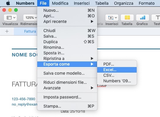 Con il foglio di calcolo da convertire aperto in Numbers per Mac, seleziona il comando da menu File > Esporta Come > Excel.