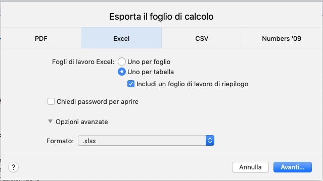 Nella versione Mac di Numbers è anche possibile scegliere se esportare in formato Microsoft Excel Office Open XML (.xlsx) oppure Office 97 o versioni successive (.xls).