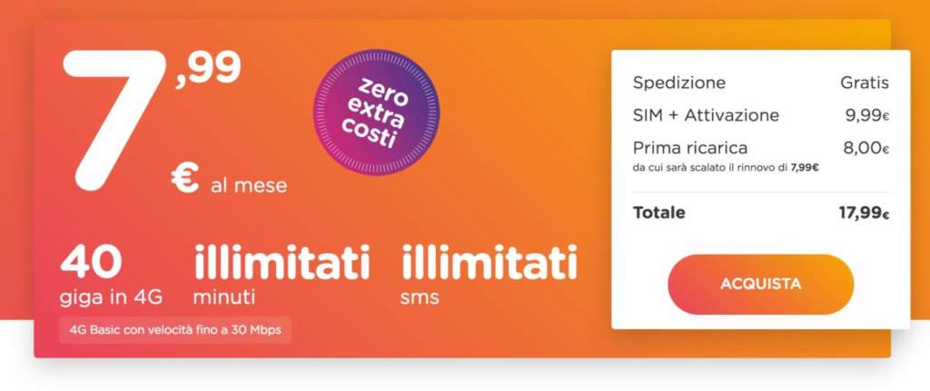 L’operatore virtuale assicura che la sua rete mobile copre il 99% della popolazione in Italia di cui il 98% con la rete 4G Basic, appunto con una velocità fino a 30 Mbps in download e upload.
