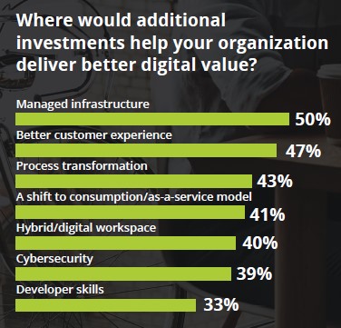 I dati a supporto di ciò, mostrano che il 50% delle aziende pensa che ulteriori investimenti in infrastrutture gestite aiuteranno a fornire un migliore valore digitale mentre il 30% afferma di creare nuovi prodotti congiuntamente con clienti e partner.