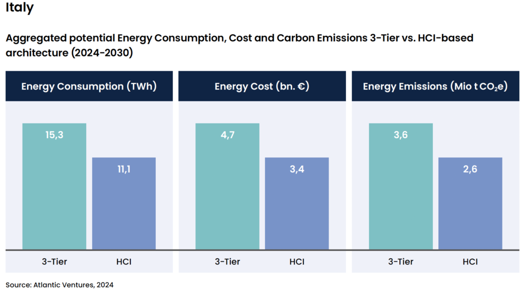 • Un risparmio pari a 25 miliardi di euro – Il vantaggio economico derivante dalla riduzione del consumo di elettricità potrebbe arrivare a 25 miliardi di euro entro il 2030, offrendo alle aziende la preziosa opportunità di conciliare la sostenibilità con la redditività. A fronte di uno dei livelli di prezzo più elevati per l’elettricità, i potenziali risparmi in termini di costi dell’elettricità per aziende e service provider in Italia potrebbe ammontare a 1,3 miliardi di euro tra il 2024 e il 2030 con il passaggio a una piattaforma HCI.