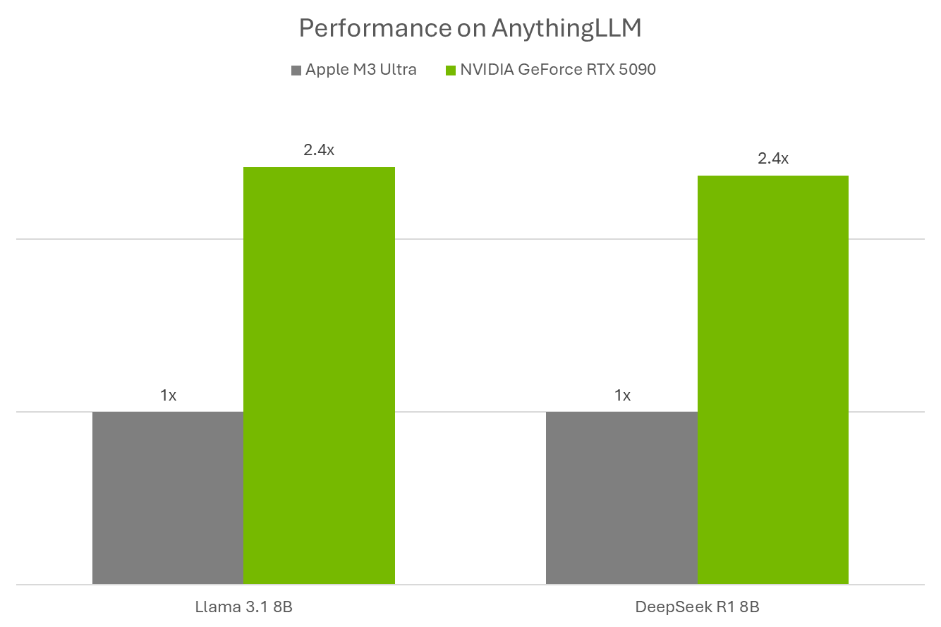 AnythingLLM sfrutta Ollama per gestire l’esecuzione locale dei modelli, utilizzando Llama.cpp e le librerie ggml tensor per il machine learning. Queste tecnologie sono ottimizzate per le GPU NVIDIA RTX e i Tensor Core di quinta generazione, offrendo un notevole vantaggio prestazionale: su una GeForce RTX 5090, afferma NVIDIA, le performance sono 2,4 volte superiori rispetto a un Apple M3 Ultra.