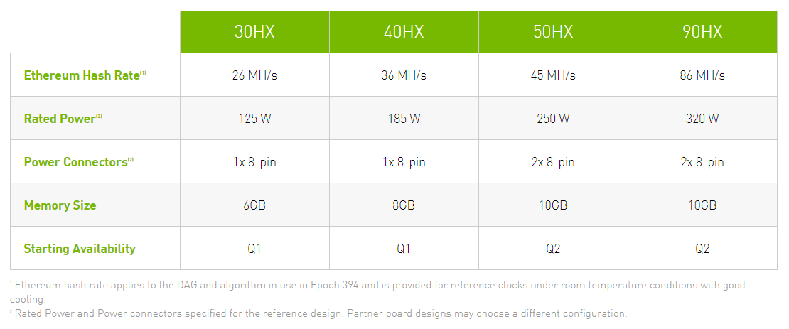 Della linea di prodotti Nvidia CMP HX per il mining professionale di criptovalute non si hanno ancora dettagli completi ma si sa che i modelli saranno (almeno inizialmente) quattro, due attesi entro il primo trimestre dell’anno e gli altri due per il secondo trimestre.