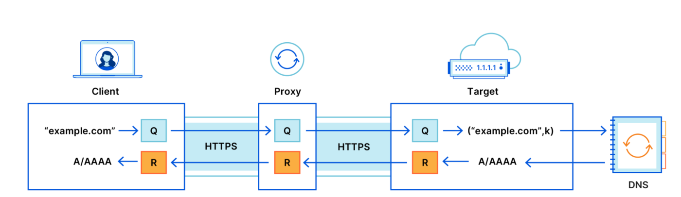 ODoH è un protocollo emergente in fase di sviluppo presso l’IETF: funziona aggiungendo un livello di crittografia a chiave pubblica, così come un proxy di rete tra client e server DoH, come 1.1.1.1. La combinazione di questi due elementi addizionali garantisce che solo l’utente abbia accesso sia ai messaggi DNS che al proprio indirizzo IP contemporaneamente.