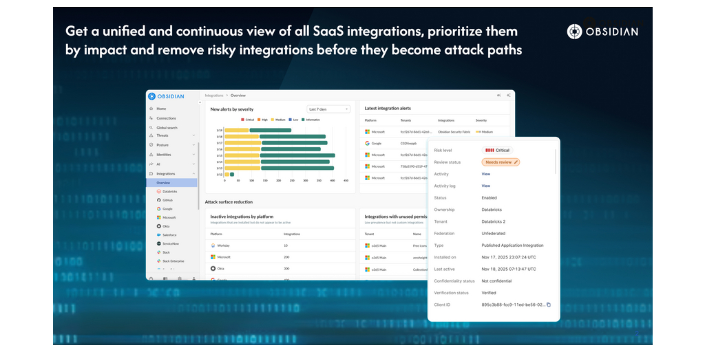 Full visibility into SaaS integration risk: Compared to endpoint or human to SaaS vendors, Obsidian unifies identity, permissions, OAuth scopes and activity data into a single coherent model, allowing organizations to not only see what an app can access but how it behaves across users, geographies and services. With this clarity, teams can quickly identify risky or inactive integrations, prioritize integrations in order of criticality, and safely take action like revoking access or blocking integrations before they are abused. Organizations can now reduce exposure at the source by identifying and restricting which users are able to grant and authorize new SaaS integrations, enforcing least privilege and limiting the introduction of risky connections before they spread.