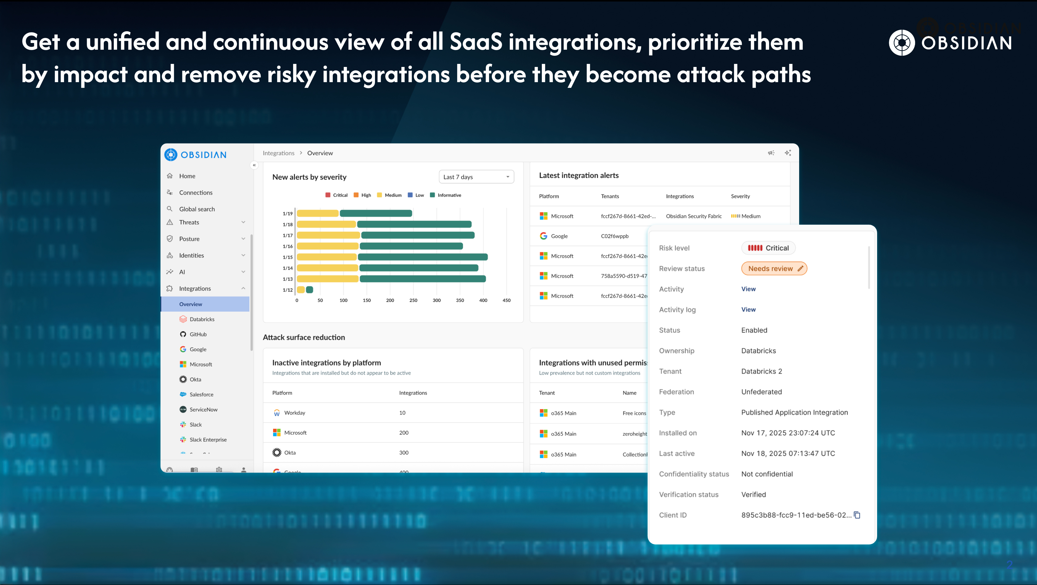 Full visibility into SaaS integration risk: Compared to endpoint or human to SaaS vendors, Obsidian unifies identity, permissions, OAuth scopes and activity data into a single coherent model, allowing organizations to not only see what an app can access but how it behaves across users, geographies and services. With this clarity, teams can quickly identify risky or inactive integrations, prioritize integrations in order of criticality, and safely take action like revoking access or blocking integrations before they are abused. Organizations can now reduce exposure at the source by identifying and restricting which users are able to grant and authorize new SaaS integrations, enforcing least privilege and limiting the introduction of risky connections before they spread.