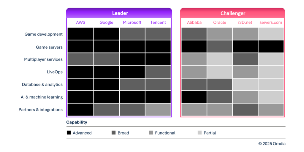 The Omdia Market Radar: Cloud Platforms for Games – 2025, published on Omdia’s Games Tech Intelligence Service, reveals an increasingly competitive marketplace for cloud platforms in the games industry. AWS, Google Cloud, and Microsoft Azure again emerge as market leaders, and are joined this year by Tencent Cloud. These four platforms each have distinct strengths and weaknesses but have in common the ability to offer robust capabilities across a wide range of games industry use cases.