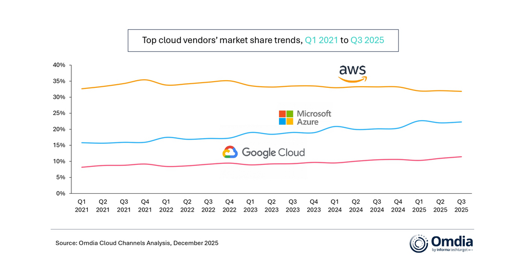 In Q3 2025, AWS, Microsoft Azure, and Google Cloud maintained their market rankings from the previous quarter, collectively accounting for 66% of global cloud infrastructure spending. Together, the three hyperscalers delivered 29% year-on-year growth.