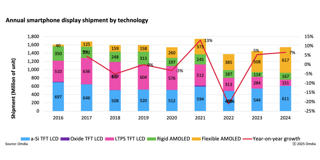 The global smartphone display market grew 7% year-over-year (YoY) in 2024, reaching 1.55 billion units, marking its second consecutive year of growth. Total AMOLED display shipments roses to 784 million units, a 26% YoY increase, while TFT LCD shipments declined to 761 million units, an 8% YoY decrease. As result, AMOLED display shipments surpassed TFT LCD shipments for the first time, accounting for 51% of total smartphone display shipments in 2024.