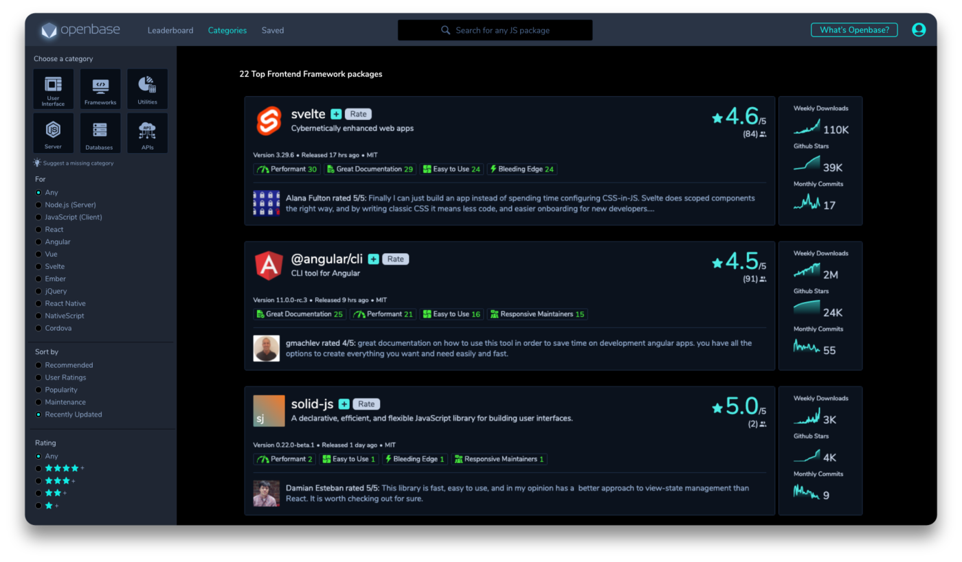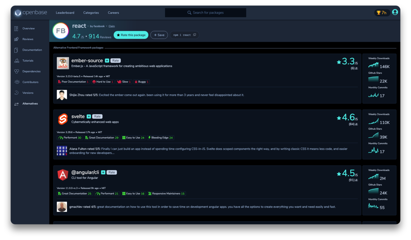 Per questo, fin dalla sua nascita, Openbase ha lavorato per costruire la piattaforma definitiva per aiutare gli sviluppatori e le organizzazioni a scegliere ogni volta il pacchetto giusto. Tra gli strumenti messi a disposizione c’è la prima piattaforma di recensioni per pacchetti open source, che ha rapidamente accumulato decine di migliaia di valutazioni da parte degli utenti, e sono state categorizzate decine di migliaia di pacchetti.