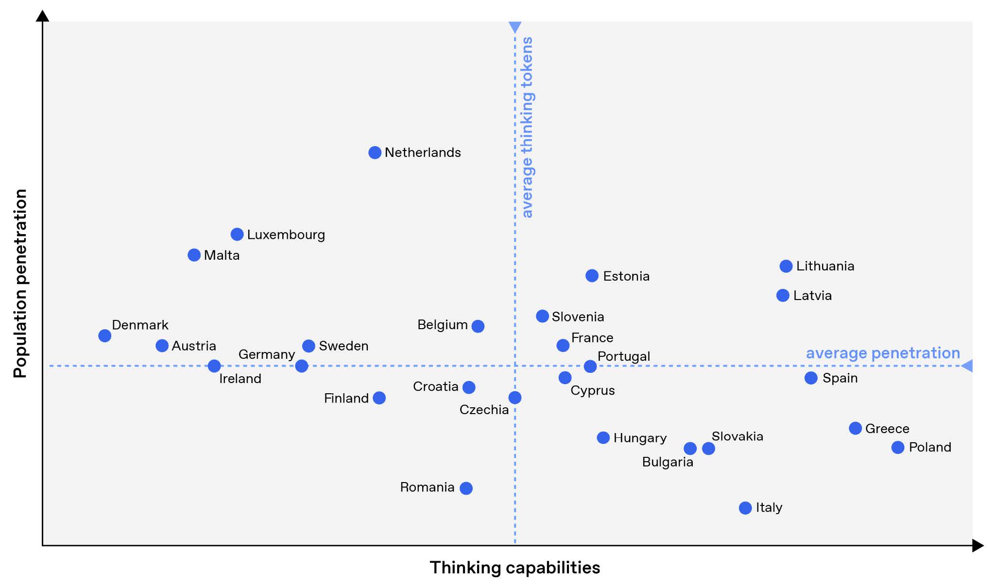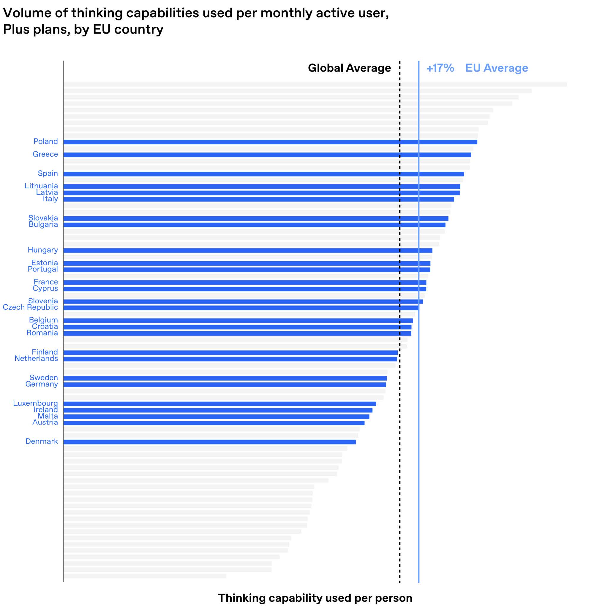 A livello europeo, l’uso medio delle capacità avanzate è superiore alla media globale, ma con differenze molto marcate tra Paesi, che arrivano a circa il 40% tra i contesti più e meno intensivi. Questo conferma che non esiste un’unica traiettoria europea dell’AI, ma più modelli di adozione che richiedono risposte differenziate.