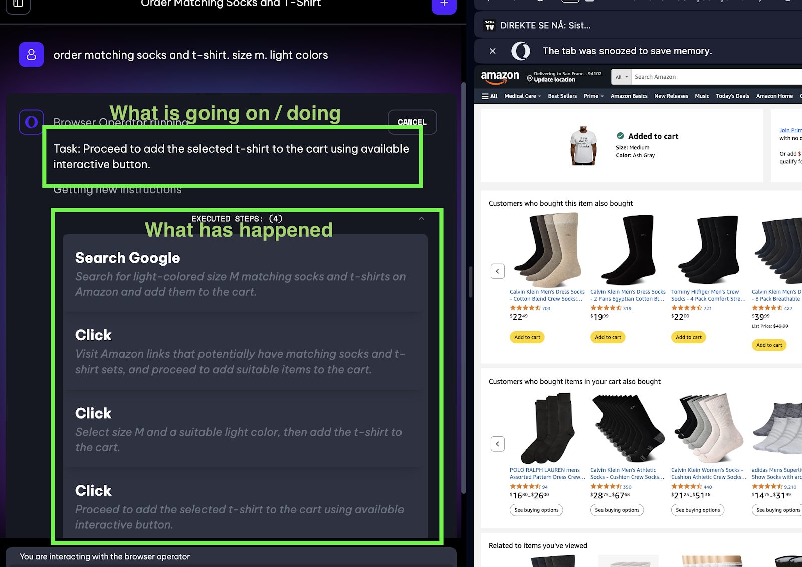 Gli utenti possono, ad esempio, chiedere di acquistare una confezione di 10 paia di calzini da tennis bianchi della Nike in taglia 12. Il Browser Operator si occuperà quindi di eseguire le operazioni per loro. Il Browser Operator eseguirà questo compito, liberando il tempo dell’utente che altrimenti sarebbe stato dedicato a questo compito banale. Ciò è in linea con il ruolo più ampio del browser, afferma Opera, che ha il compito di rendere gli utenti “più potenti” quando sono online e di fornire loro strumenti per utilizzare il loro tempo in modo più efficiente.