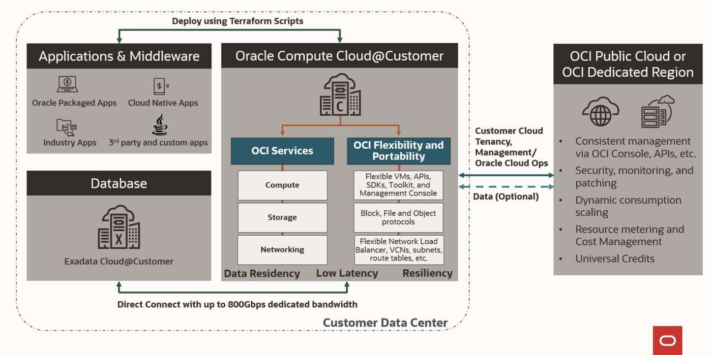 Le offerte on-premise di altri provider di cloud pubblico sono assemblate con componenti di terze parti, oppure dispongono di funzionalità molto limitate, afferma Oracle; Oracle Compute Cloud @ Customer invece è una piattaforma cloud proprietaria completamente integrata, creata, installata e gestita da Oracle. È pienamente compatibile con le Cloud Region OCI pubbliche e con OCI Dedicated Region, e offre gli stessi servizi cloud core di OCI allo stesso prezzo vantaggioso. Tutto ciò riduce il peso delle attività di manutenzione e aggiornamento a carico del cliente e consente, allo stesso tempo, di sviluppare ed eseguire ovunque applicazioni cloud native