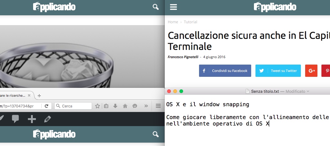 Il window snapping è una funzione molto utile per chi lavora con diverse finestre aperte, su qualsiasi sistema operativo. Il termine indica genericamente la possibilità di “attaccare” automaticamente le finestre delle applicazioni in luoghi precisi del display, di solito i quattro “quarti” ottenuti suddividendolo per i lati, in modo da avere sott’occhio più finestre contemporaneamente. Vediamo come fare, con OS X direttamente e non solo.
