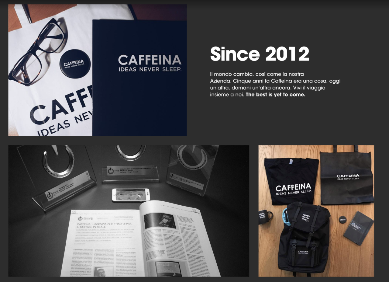 Caffeina è una creative digital agency che vanta nel suo team oltre 80 millennial e nativi digitali, che lavorano a progetti innovativi, mettendo a sistema creatività, tecnologia e marketing. Ceo è Tiziano Tassi.