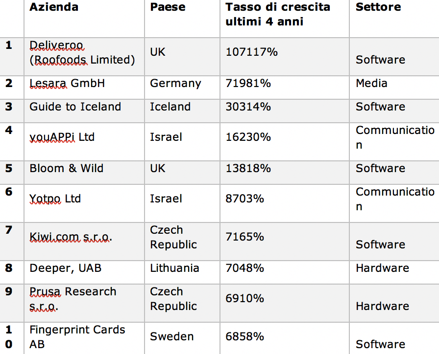 La Fast 500 di Deloitte premia le aziende che hanno registrato il più alto tasso di crescita dei ricavi negli ultimi 4 anni. Il programma, viene organizzato ogni anno da Deloitte in 3 continenti Nord America, Emea e Asia-Pacifico e quest’anno vede coinvolti oltre 18 Paesi dell’area EMEA.