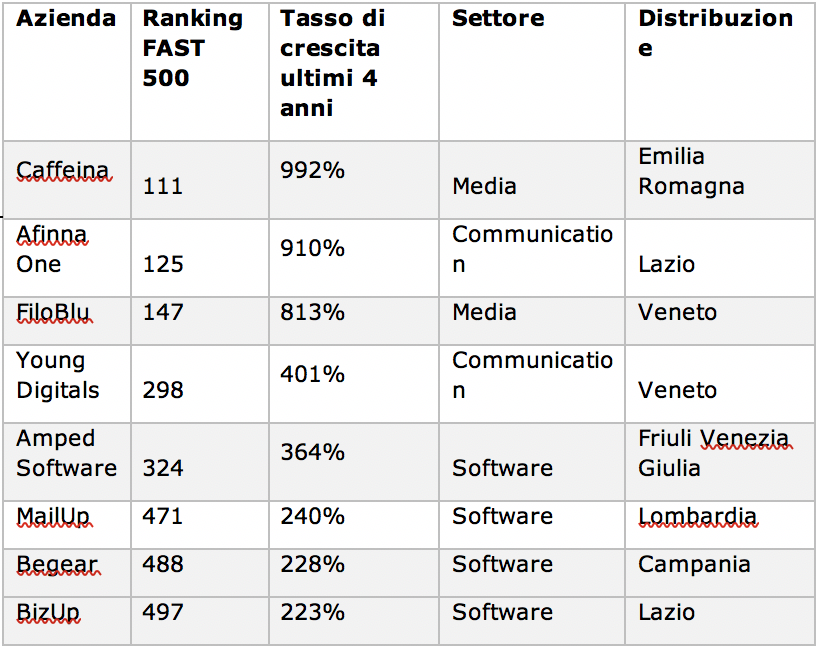 Sono, in ordine di classifica, Caffeina, Afinna One, FiloBlu, Young Digitals, Amped Software, MailUp, Begear e BizUp.