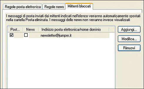 nella cui finestra centrale sono elencati i mittenti tuttora bloccati. Selezionare