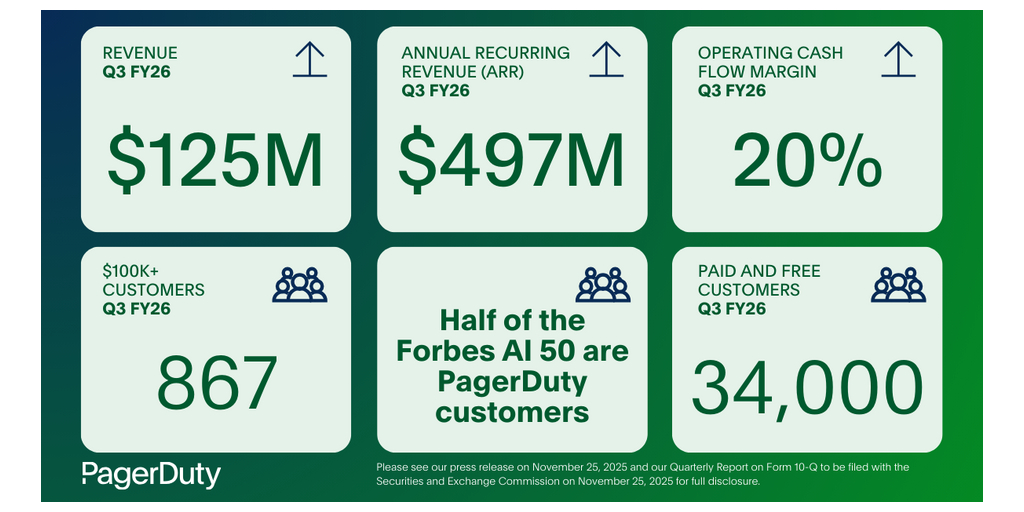 “PagerDuty delivered $125 million in revenue and our second consecutive quarter of GAAP profitability, reflecting disciplined execution and continued margin expansion,” said Jennifer Tejada, Chairperson and CEO of PagerDuty. “As enterprises scale AI, operational resilience is mission-critical for the 34,000 paid and free customers that rely on PagerDuty. We are operating from a position of strength—product leadership, a strong balance sheet, and robust free cash flow—while advancing a pricing and go-to-market transition that supports durable growth.”