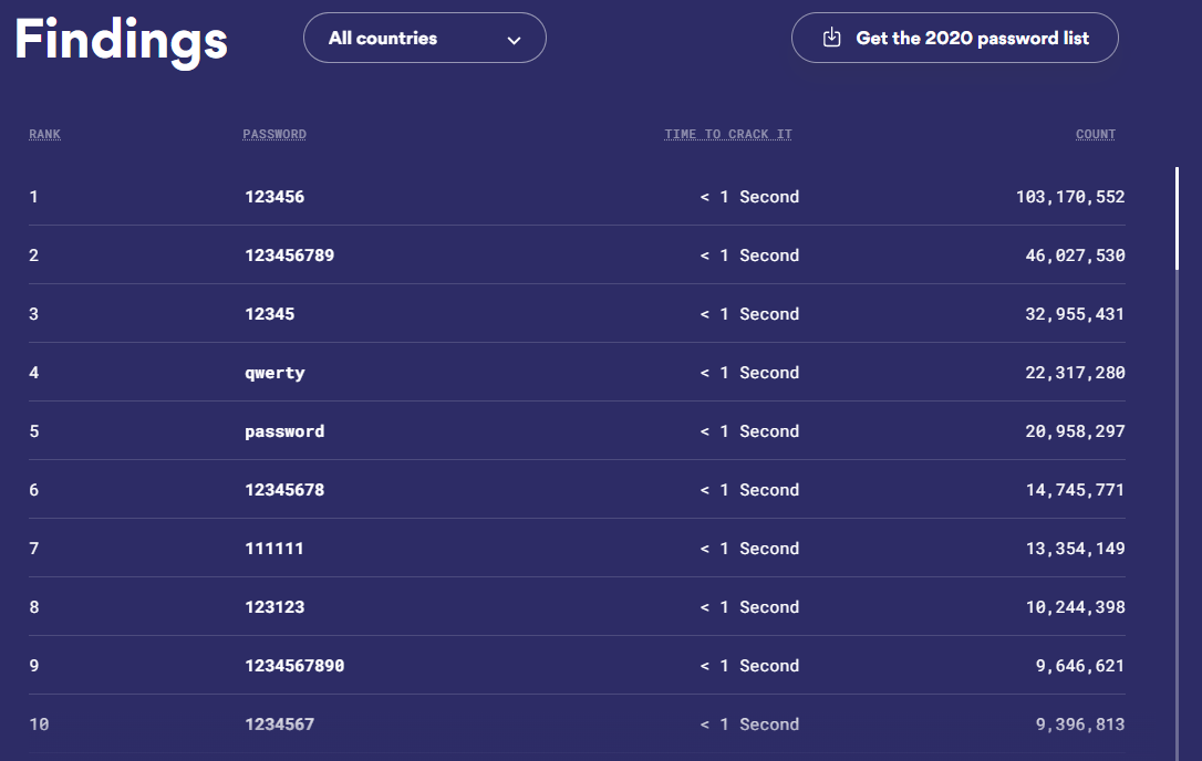 La ricerca è stata effettuata su 50 Paesi: l’analisi fornisce anche dettagli su quante volte è stata usata una certa password e – aspetto interessante e inquietante al tempo stesso – quanto tempo ci vorrebbe per decifrarla.