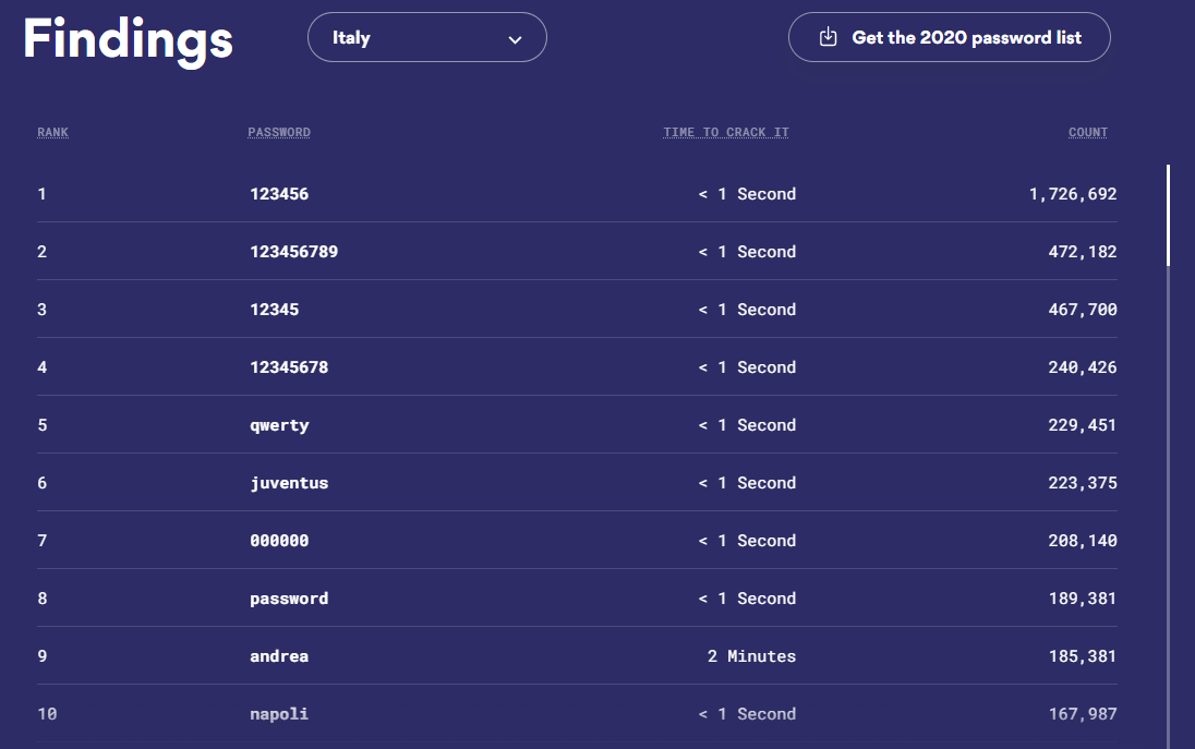 Per quanto riguarda l’Italia, le prime quattro tra le password più utilizzate sono banali sequenze di cifre: la prima è “123456”, che anche l’anno scorso poteva vantare questo poco encomiabile primato. Ed è seguita da “123456789”, “12345”, “12345678”.