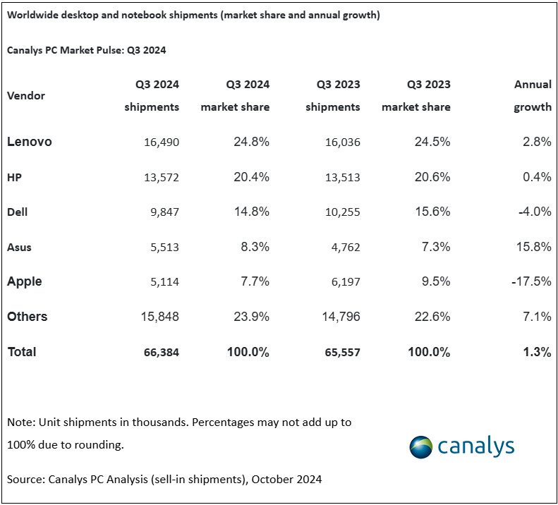 Dell ha mantenuto la terza posizione, ma ha visto le sue spedizioni calare del 4% su base annua a 9,8 milioni di unità. Asus ha conquistato il quarto posto, vantando la crescita più elevata tra i principali fornitori con un aumento del 16% su base annua, mentre Apple ha completato la top five con 5,1 milioni di Mac spediti.