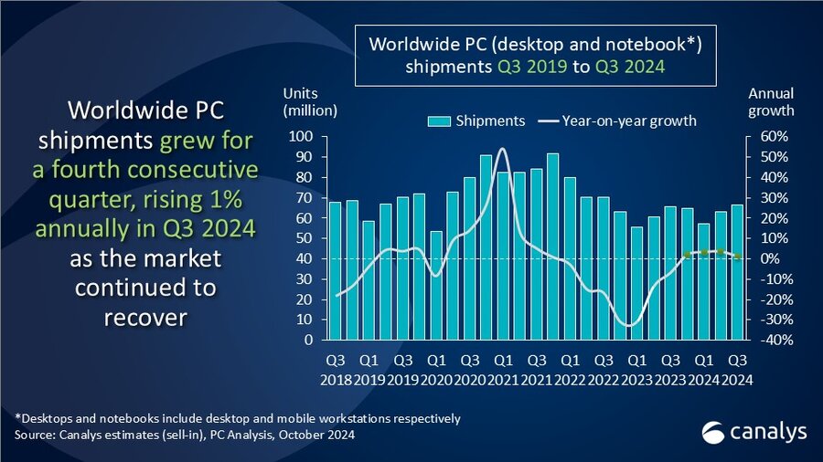 Secondo gli ultimi dati del servizio di PC Analysis di Canalys, il mercato globale dei PC è cresciuto su base annua per il quarto trimestre consecutivo, con un aumento delle spedizioni totali di desktop, notebook e workstation dell’1,3% a 66,4 milioni di unità.