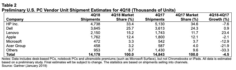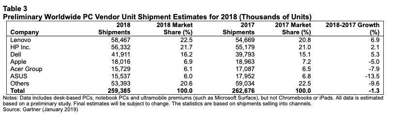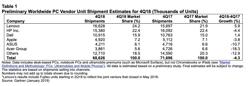 Lenovo ha superato HP passando alla prima posizione nel mercato globale dei Pc, nel quarto trimestre del 2018. Un fattore importante per la crescita di Lenovo, Gartner ritiene sia una joint venture con Fujitsu formata a maggio 2018. Lenovo ha fatto registrare anche un forte trimestre negli Stati Uniti. Nonché tre trimestri consecutivi di crescita a due cifre delle spedizioni anno su anno, nonostante il mercato generale stagnante.