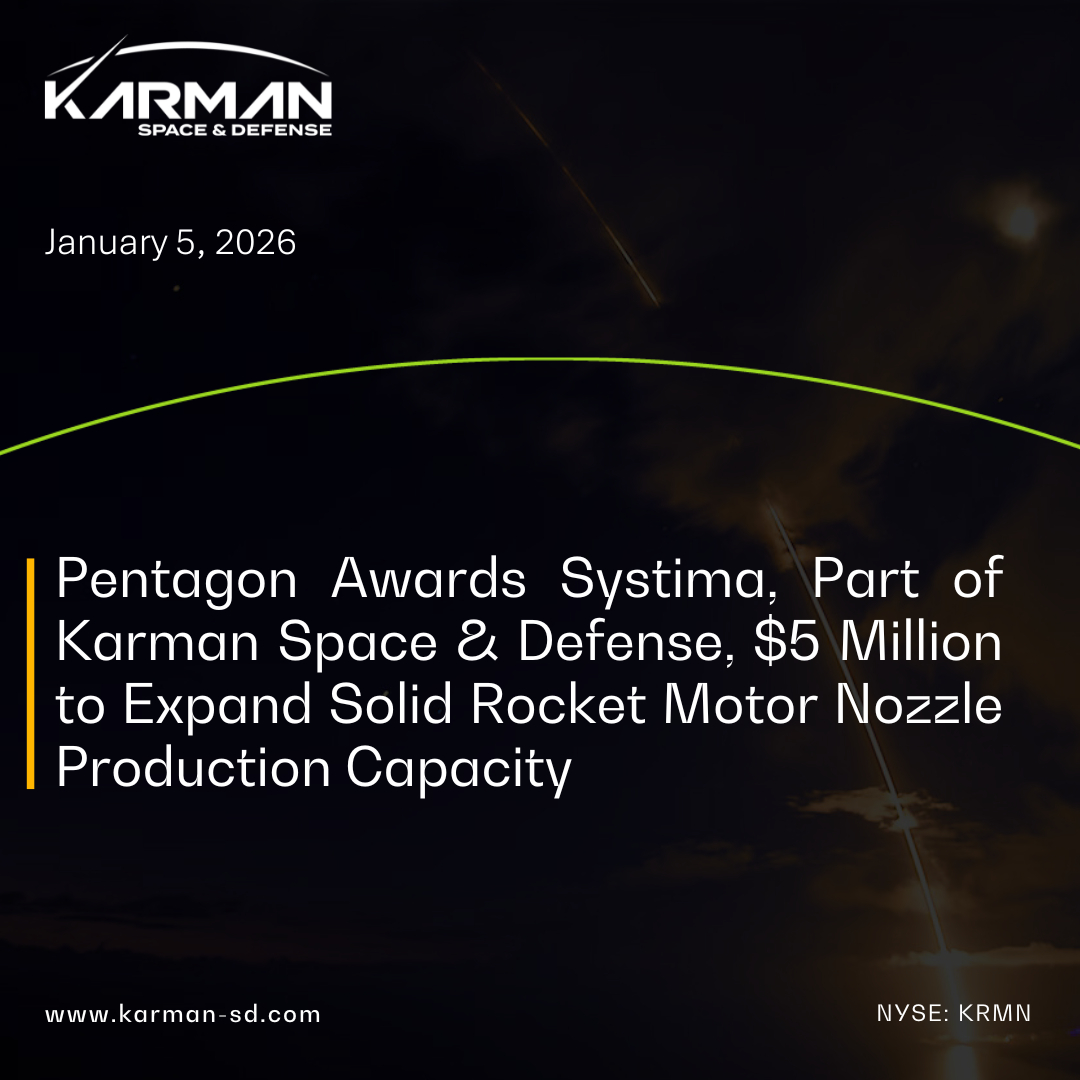 HUNTINGTON BEACH, Calif.--(BUSINESS WIRE)--$KRMN #ImpossibleEndsHere--Karman Space & Defense (“Karman”, “Karman Holdings, Inc.” or “the Company”) (NYSE: KRMN), a leader in the rapid design, development and production of critical, next-generation system solutions for launch vehicle, satellite, spacecraft, missile defense, hypersonic and UAS customers, today announced its Systima facility in Mukilteo, WA received $5.0 million in Defense Production Act Title III funding from the U.S. Department of War on October 20, 2025 to expand the Company’s capacity to produce solid rocket motor (“SRM”) nozzles.