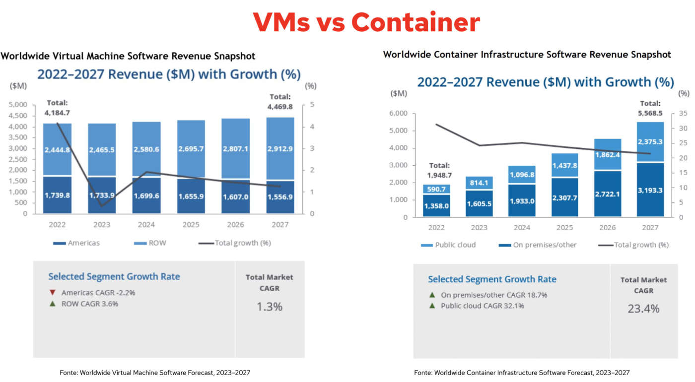 Parallelamente, il Worldwide Virtual Machine Software Forecast, 2023–2027, prevede che i sistemi di virtualizzazione tradizionali mostreranno un andamento stabile con un CAGR del 1,3%, mentre si osserva un notevole aumento nell’adozione della containerizzazione, con un CAGR del +23,4%, indicando come la tendenza attuale sia quella di virtualizzare direttamente sui container, un cambiamento che impone agli operatori IT, inclusi partner e reseller, di adottare le tecnologie più innovative per rimanere al passo con i tempi.
