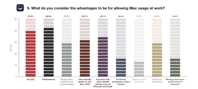 Gli insight principali estraibili dallo studio di Parallels sono che: il 55,7% delle piccole e medie imprese è ora pronto per consentire i dispositivi Mac sul posto di lavoro. La performance è il principale vantaggio percepito dell’utilizzo dei computer Apple al lavoro, con la sicurezza al secondo posto.