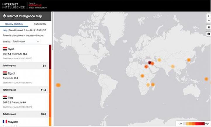 Un altro passo che è possibile intraprendere è consultare la Internet Intelligence Map di Oracle. Questa mappa è una risorsa online gratuita disponibile a questo indirizzo. Essa consente agli utenti di sapere in che modo disastri naturali, blocchi di Internet imposti dai governi e interruzioni dei cavi in fibra ottica incidono sul traffico Internet mondiale.