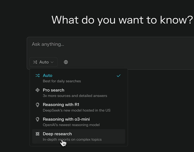 Perplexity Deep ResearchPer provarla, basta andare su perplexity.ai e selezionare “Deep Research” dal selettore di modalità nella casella di ricerca prima di inviare la propria query.