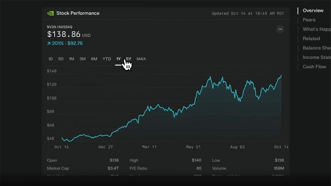 A partire dal settore Finance, che Aravind Srinivas definisce un verticale importante per molte ricerche quotidiane, Perplexity è ora in grado di gestire i prezzi delle azioni in tempo reale, di fare approfondimenti sui dati finanziari di un’azienda, di confrontare più aziende, di studiare i 13f degli hedge fund (i documenti che gli hedge fund e altri grandi investitori istituzionali devono presentare trimestralmente alla Securities and Exchange Commission, SEC, degli Stati Uniti) e così via, con un’interfaccia utente piacevole.