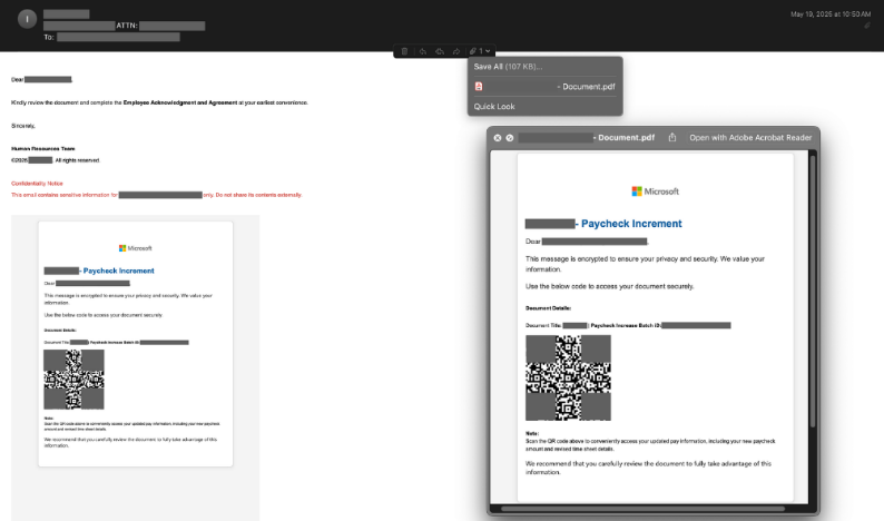 Anche i codici QR vengono sempre più usati dai cybercriminali nelle e-mail di phishing. Gli aggressori sfruttano la fiducia che le vittime hanno verso marchi famosi per indurle a scansionare il codice, che le reindirizza a pagine di phishing spesso protette da CAPTCHA per sembrare più credibili. In molte e-mail di phishing con codice QR l’intero messaggio è incorporato nel PDF, visibile appena l’e-mail viene aperta. Questo rende difficile per i filtri e-mail rilevare il phishing, poiché i motori di rilevamento si basano su testi o parole chiave. L’analisi del contenuto richiederebbe il riconoscimento ottico dei caratteri (OCR), ma questo processo può essere impreciso e costoso, rendendo più difficile individuare gli attacchi.