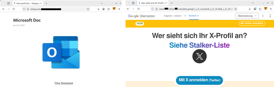 Pagina di phishing imita un documento Office basato su Telegraph (sinistra)