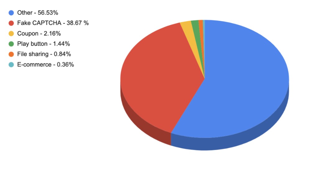 Unit 42 ha identificato cinque principali schemi utilizzati dagli attaccanti per convincere le persone a cliccare su link e pulsanti incorporati nei PDF, e li ha suddivisi così: Fake Captcha, Coupon, Pulsante Play, File Sharing ed eCommerce.
