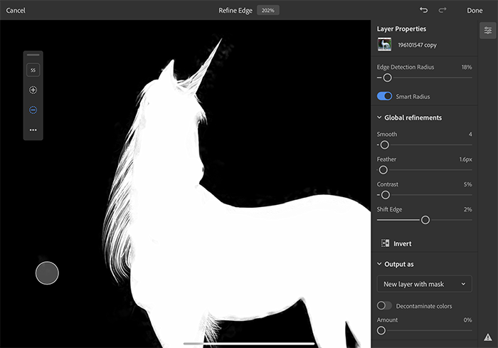 Nella prima metà del 2020, invece, arriverà su iPad il pennello Refine Edge, uno degli strumenti di selezione più importanti in Photoshop, anch’esso prezioso per effettuare selezioni complesse e morbide dei bordi su soggetti difficili come ad esempio i capelli e altri elementi di questo tipo.
