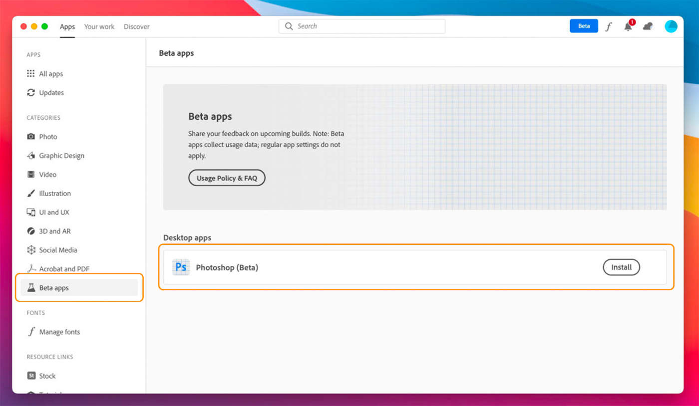 Photoshop Beta funziona in modo nativo sui dispositivi Apple con processore M1 e può essere installato dalla scheda App Beta dell’applicazione Creative Cloud Desktop.