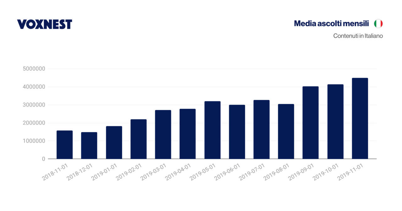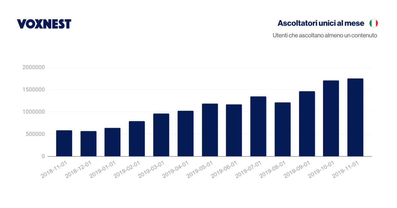 Dall’inizio del 2019, viene sottolineato nel report, si è passati da circa 60.000 a 160.000 al giorno (novembre 2019), ed è più che raddoppiata la media mensile di ascolti a partire da gennaio 2019 con un passaggio da 1.800.000 a quasi 4.500.000 (novembre 2019). Gli ascoltatori unici al mese su Spreaker (ovvero quante volte un utente accede e ascolta almeno un contenuto) da quasi 640.000 sono passati a oltre 1.700.000 (novembre 2019).