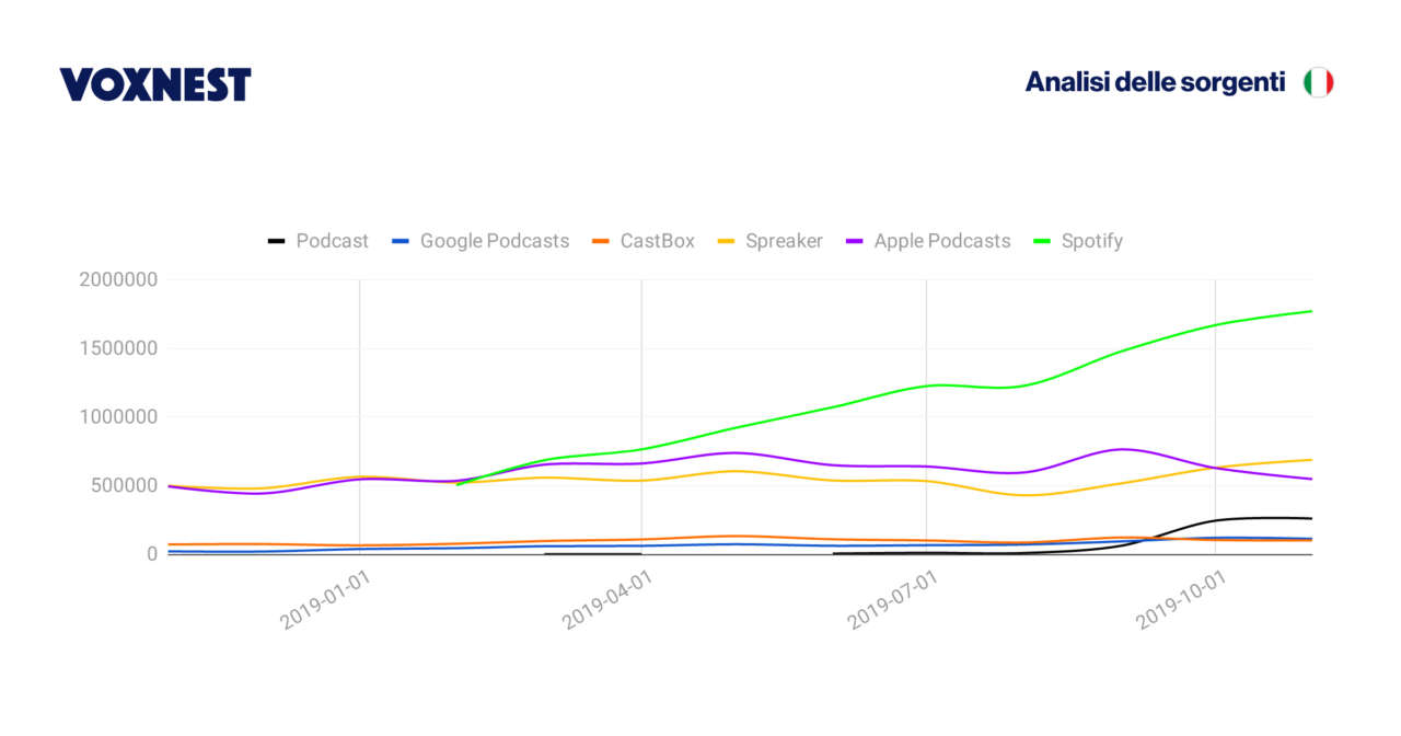 Il mercato del podcast è invece esploso già tempo fa, negli Stati Uniti, dove vive un’incessante crescita, e l’onda di questo successo potrebbe essere arrivata anche da noi. Infatti, secondo Voxnest il 2019 può essere considerato come l’anno della “scoperta” dei podcast in Italia o, come alcuni l’hanno definito, l’anno zero del podcast in Italia.