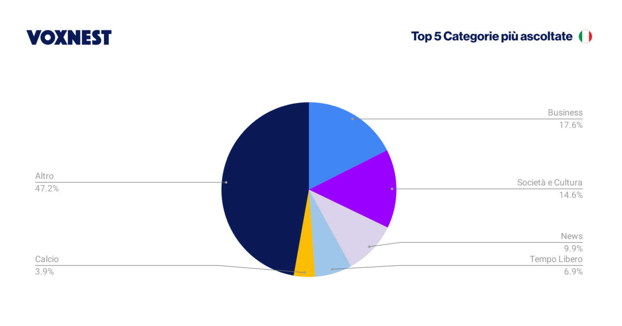 Tra l’altro, anche nelle tendenze d’ascolto degli italiani si registra una spiccata predilezione per tutto quello che è legato alle tematiche Business, prima nella Top 5 delle categorie di podcast preferite. Al secondo posto c’è poi la categoria Società e Cultura, che accoglie un vasto bacino di contenuti, informa ancora il report.