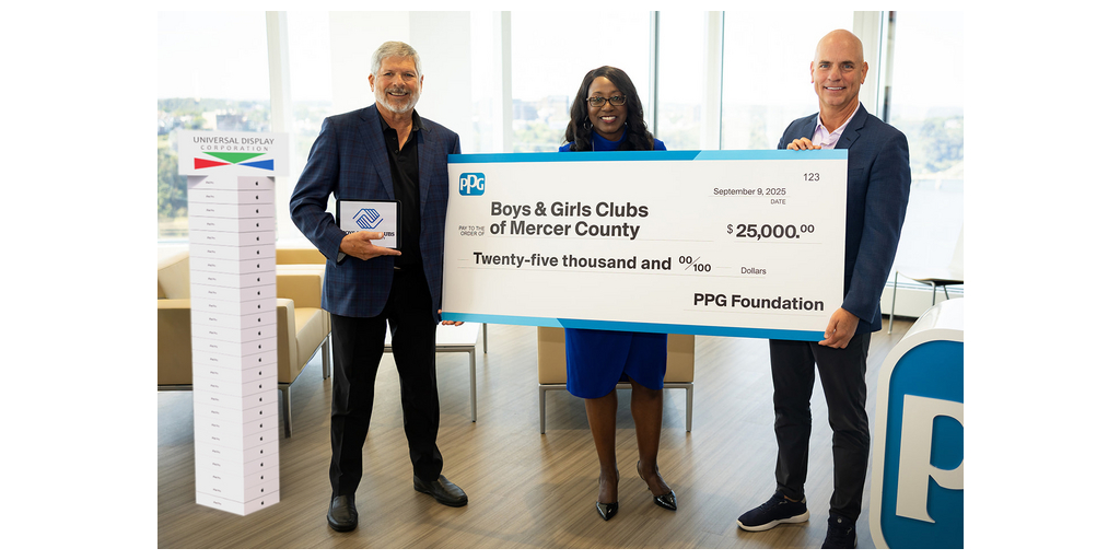 “UDC and PPG have worked hand-in-hand for 25 years to scale production of UDC’s phosphorescent OLED materials, enabling remarkable growth in the OLED industry,” said Janice Mahon, senior vice president of Technology Commercialization and general manager, Commercial Sales Business, of Universal Display Corporation. “From UDC’s early days as a pioneering startup to our global operations today, we have built powerful synergies between UDC’s leadership in OLED innovation and technology and PPG’s world-class manufacturing and operational excellence. As we celebrate this milestone, we hope our donation to the Boys & Girls Clubs of Mercer County will spark creativity, expand hands-on learning and help prepare young minds with the digital skills needed to thrive in the future.”