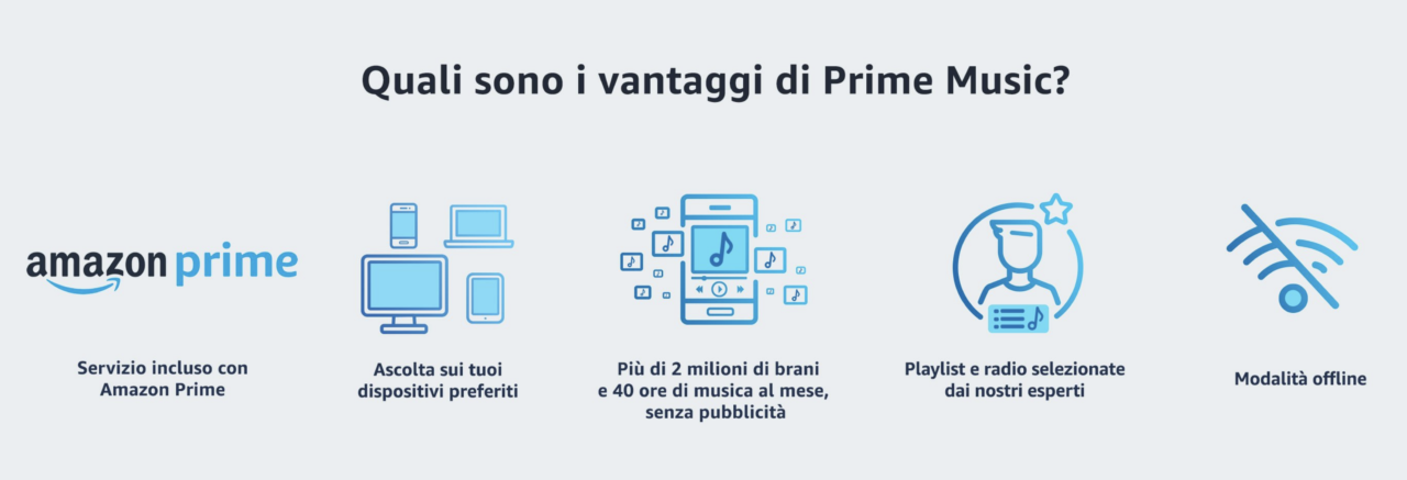 Dopo Amazon Reading, arriva un’altra offerta gratuita per gli utenti di Amazon Prime, Prime Music. Questa nuova proposta rende disponibili oltre 2 milioni di brani, che si possono ascoltare gratuitamente e senza pubblicità su un computer, su un tablet o su uno smartphone per un massimo di 40 ore al mese (di ascolto complessivo).