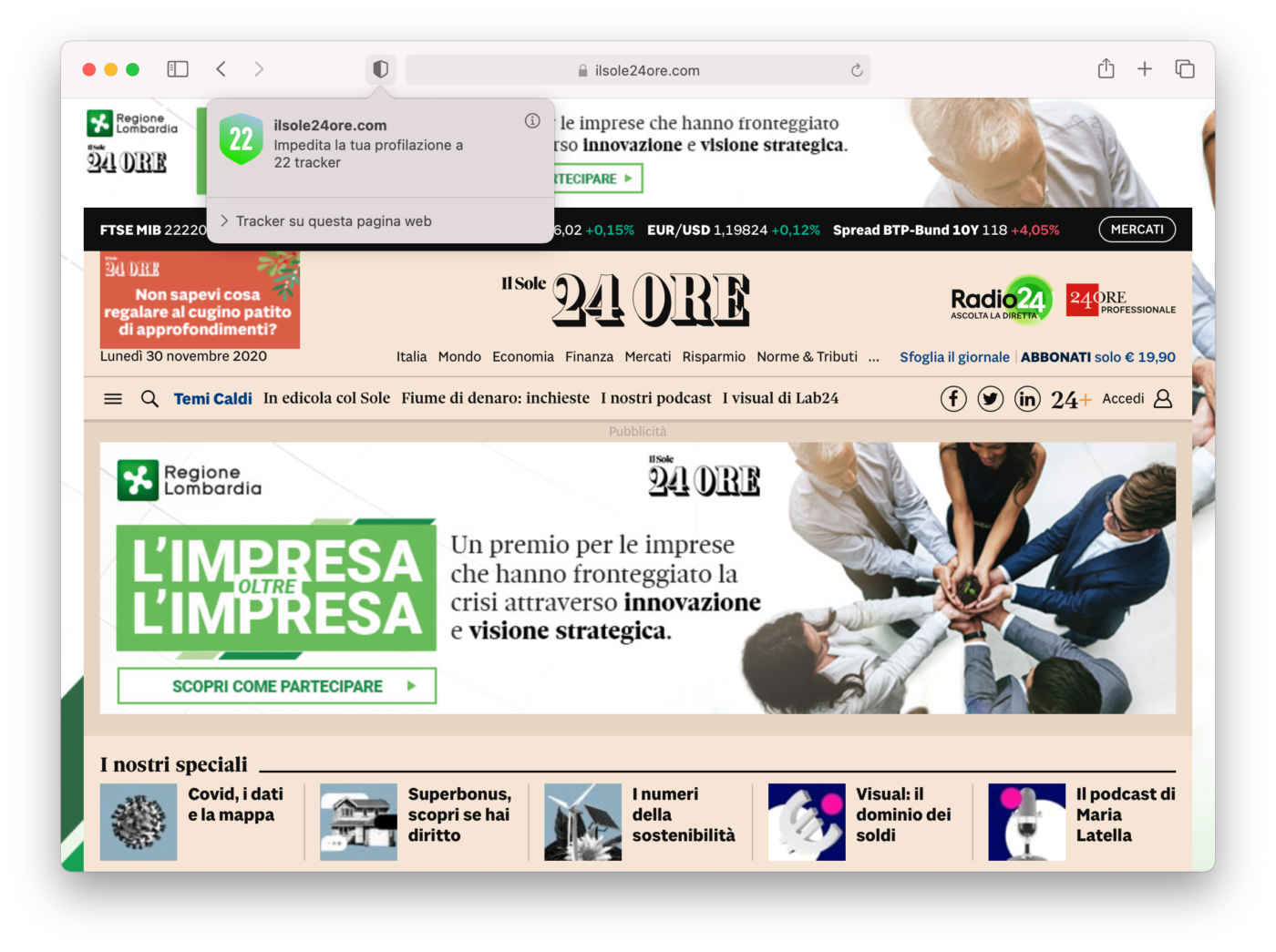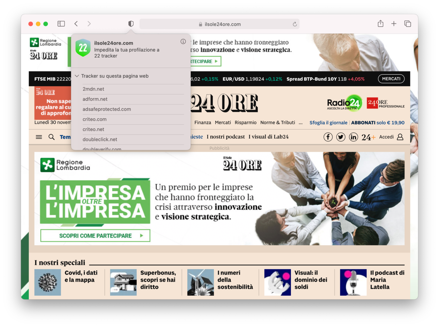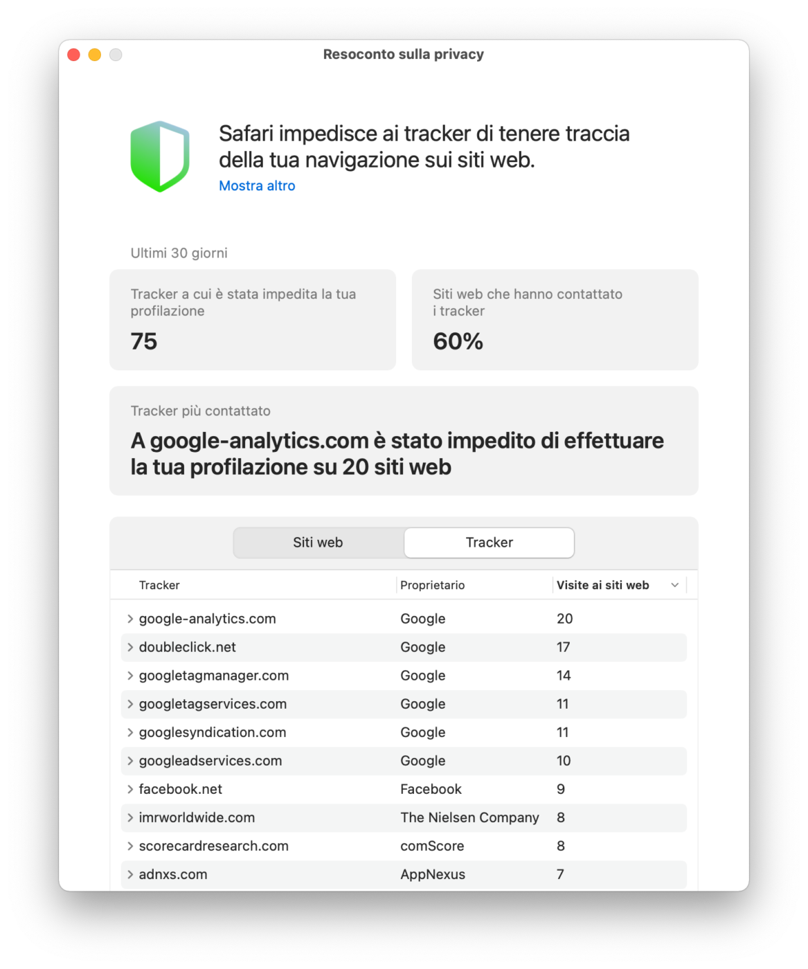 Un clic su di esso mostra il numero di tracker conosciuti individuati su quel sito, ai quali Safari ha impedito di effettuare la profilazione. Un clic sul link Tracker su questa pagina web espande il pannello per mostrare l’elenco dei tracker.