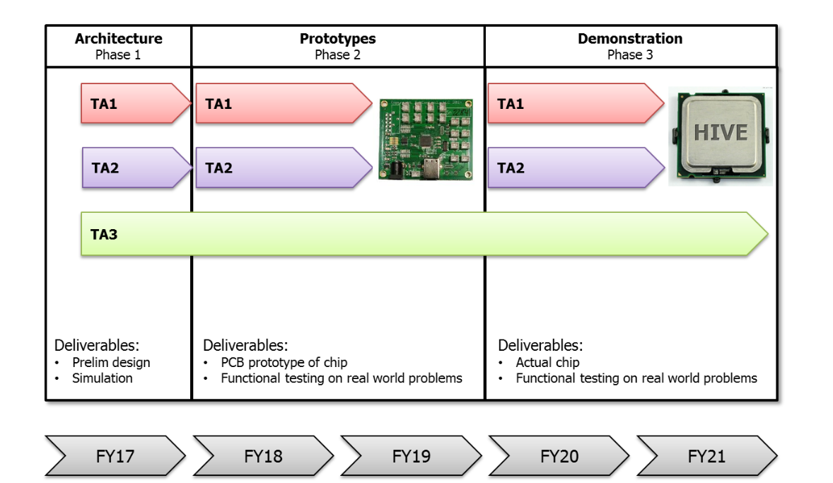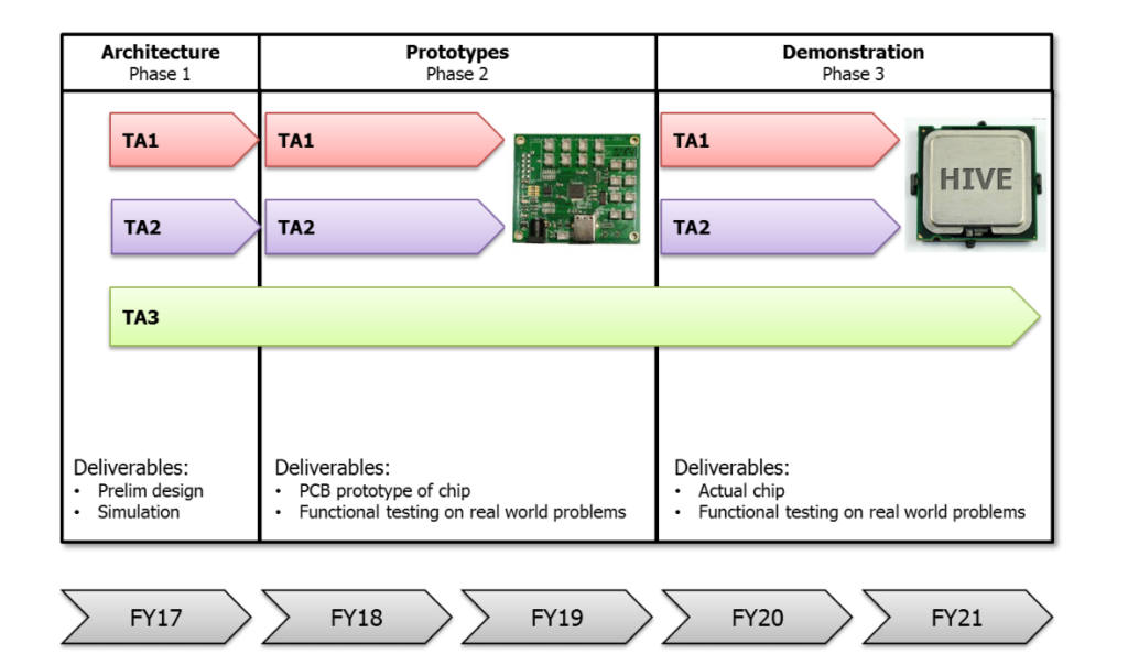 Un primo esempio della linea di sviluppo definita dalla Darpa è il processore Hive, che negli obiettivi dovrebbe essere concretizzato nel 2021. Si tratta di un graph analytics processor, studiato in modo specifico per analizzare grandi quantità di dati che assumono un significato solo quando si evidenziano le correlazioni fra loro.