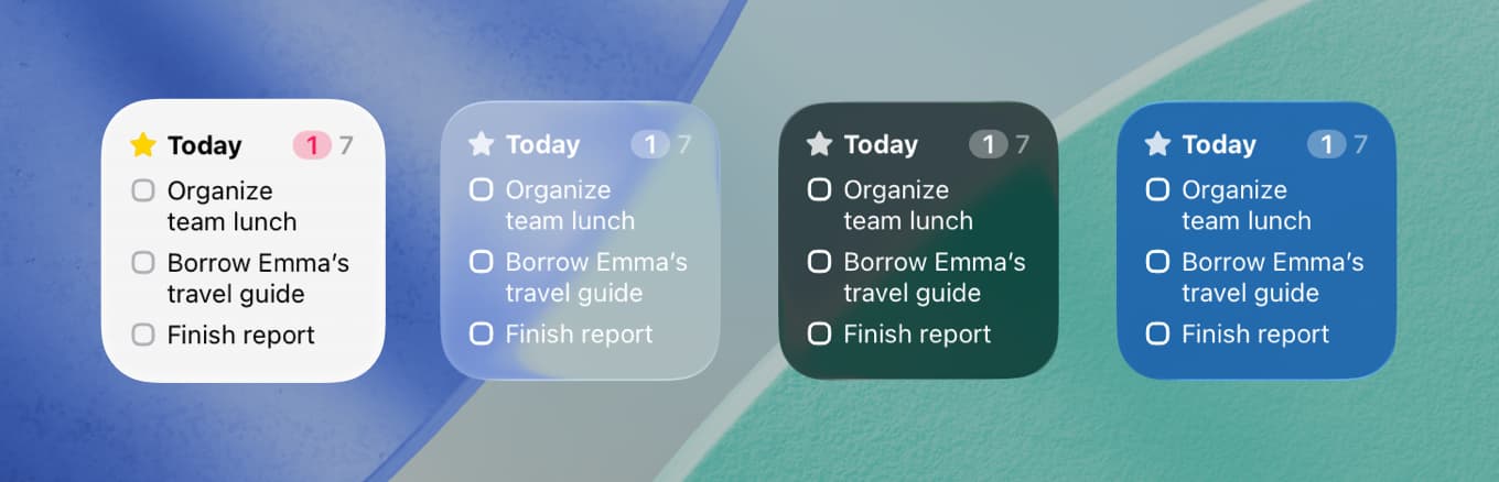 L’anno scorso il team ha aggiornato i widget di Things per supportare gli stili su iPhone e iPad. Questi stili sono ora disponibili anche su Mac e, oltre a Dark e Tinted, gli OS 26 introducono Clear, Vetro, che lascia trasparire lo sfondo. Ci sono poi vari miglioramenti: i pratici controlli del Centro di Controllo sono ora disponibili su Mac e Apple Watch; Spotlight su Mac ora può creare to-do e altri ancora.