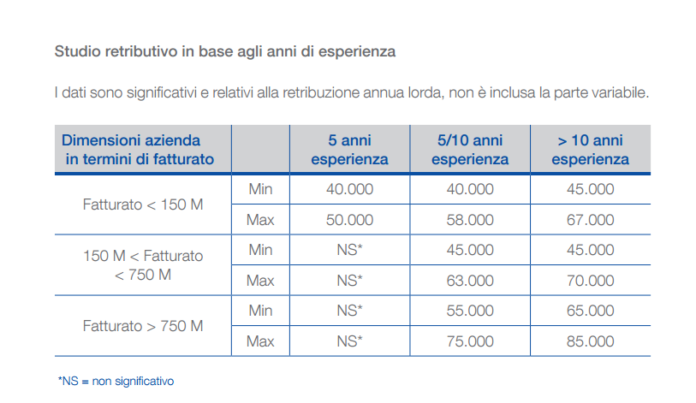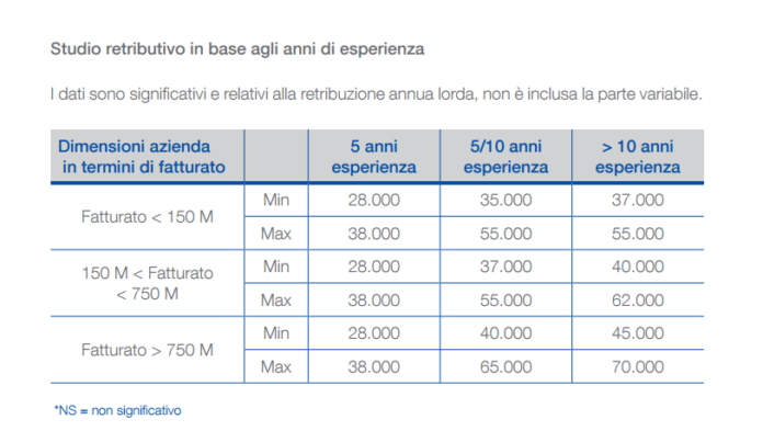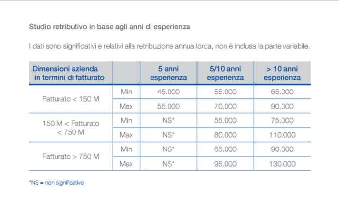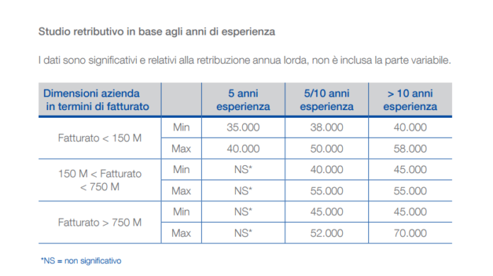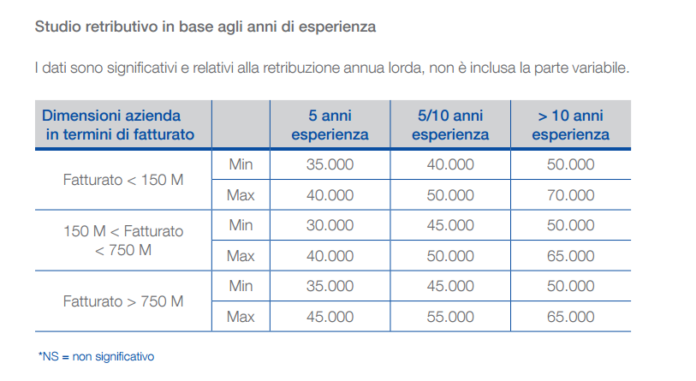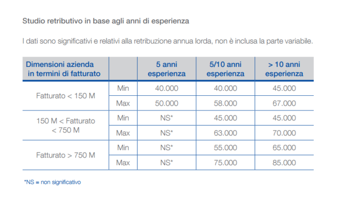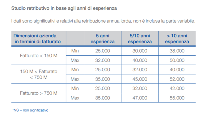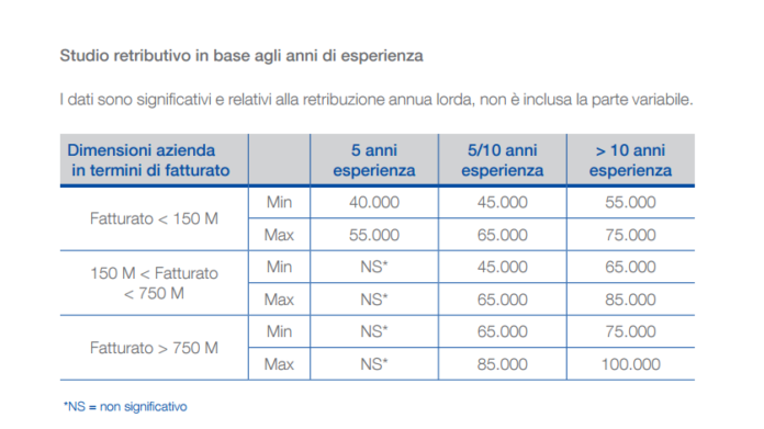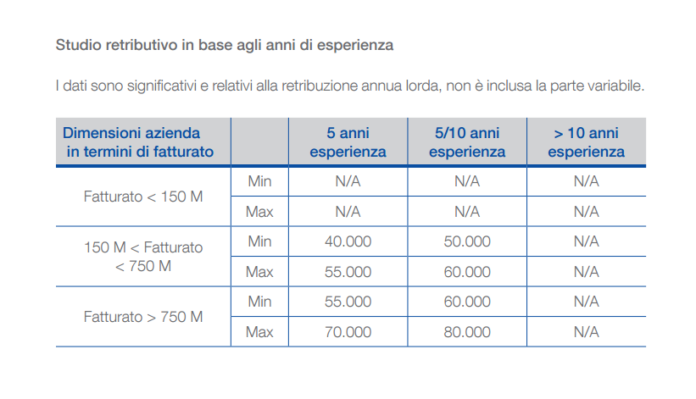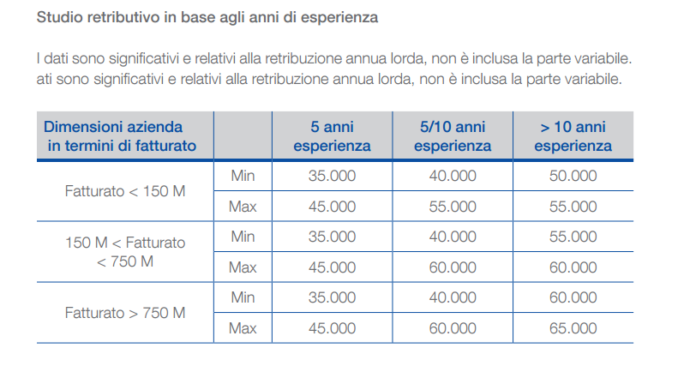 Figura relativamente nuova e riservata ad aziende di un certo livello è quella del Data manager, laureato in Ingegneria o Informatica con una formazione specifica sulla gestione dei dati. A questo unisce sotto la sua competenza anche aree relativa alle reportistica direzionale come la Business intelligence. Sempre più coinvolti nelle strategie aziendali, in particolare modo con marketing e finance, i Data manager si occupano delle tecnologie legate al Big data. Si tratta di una figura che sta crescendo velocemente nel panorama italiano e secondo il rapporto “non è da escludere che spesso andrà a ricoprire ruoli di importanza strategica”. Con conseguente aumento di stipendio che al momento è di difficile definizione anche per Michael Page. I parte da 40mila euro per cinque anni di esperienza (chi li ha) nelle aziende sopra i 150 milionidi fatturato per arrivare a 80mila per quelle più grandi.