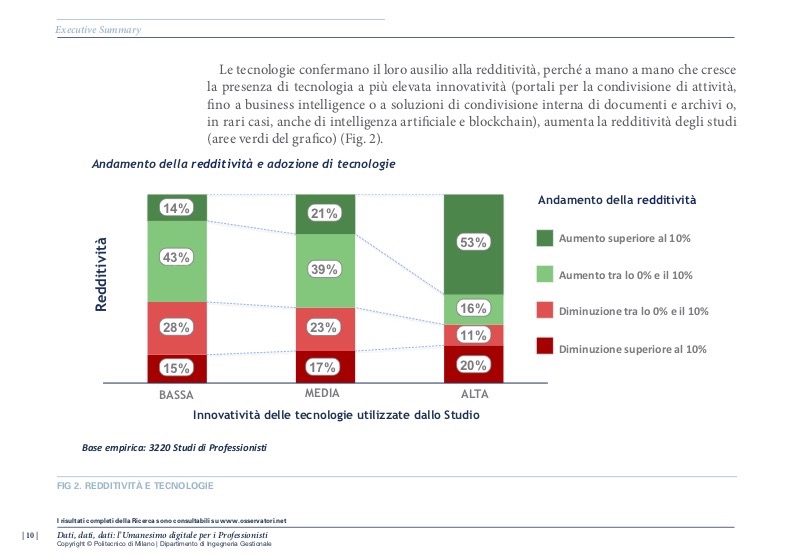 Le professioni economico-giuridiche mostrano una crescente consapevolezza sulle tematiche digitali, sulle nuove dinamiche di mercato e sull’impiego delle soluzioni informatiche in grado di migliorare con una certa ambizione i modelli organizzativi e di business. E l’impatto delle nuove tecnologie sulla redditività degli studi gli dà ragione: oltre la metà degli studi in cui sono più presenti strumenti digitali ad alto tasso di innovatività ha registrato un aumento superiore al 10%. Le sfida per il futuro sarà aumentare la diffusione di cultura innovativa e approccio collaborativo, che adesso, pur in crescita, interessa circa un terzo degli studi professionali”.