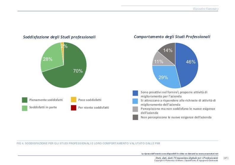 La maggior parte delle piccole e medie imprese servite dagli studi è soddisfatta dell’operato del professionista (70%), che però molto spesso è ancorato ai servizi tradizionalmente offerti e non è disponibile e pronto alle nuove esigenze delle aziende (25%) oppure attende lo stimolo esplicito del cliente per attrezzarsi e iniziare a proporre i nuovi servizi richiesti (29%).